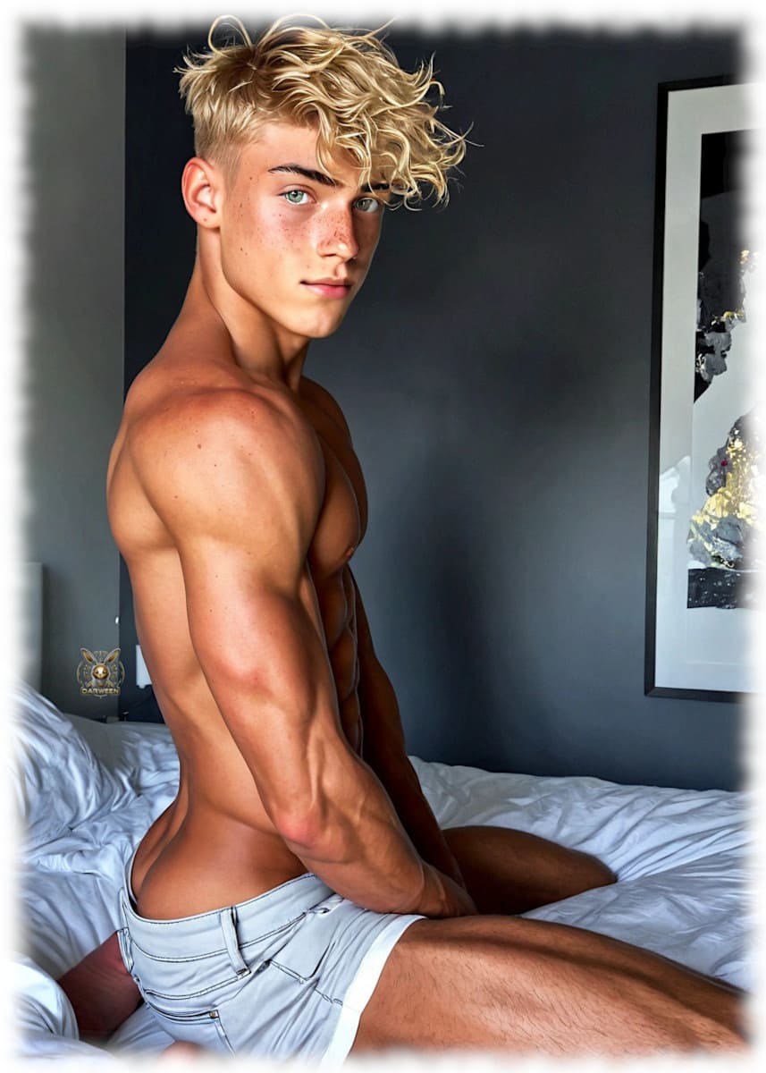 BlonderTwink seitlich auf Hotel-Bett sitzend, geöffnete Hose gibt Weg für Rosenranke der Leidenschaft frei.