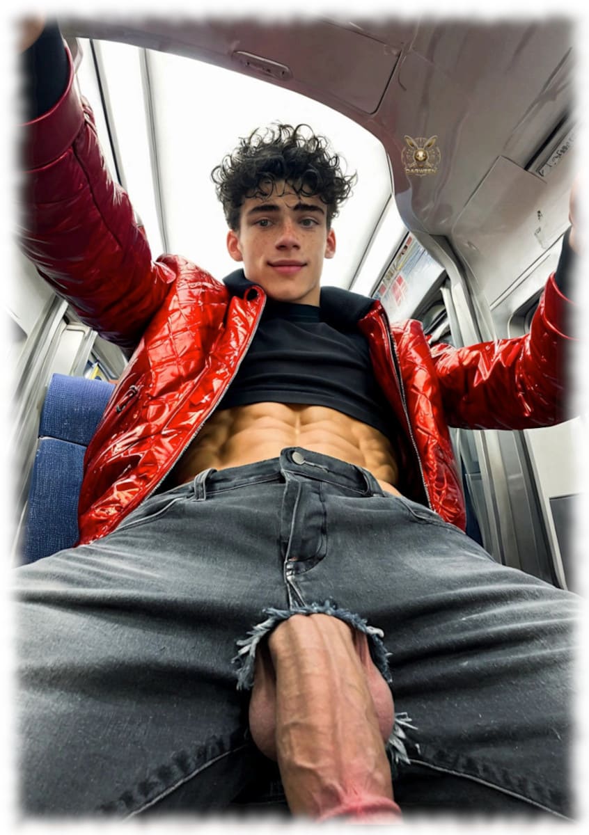 Twink in Metro sitzend mit geöffneter Hose, massives aufgerichtete Verlangen und rasierte Freudenäpfel im Zentrum.