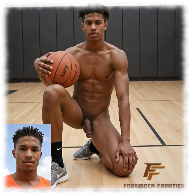 Dunkelhäutiger Basketballer, halb kniend, Lustkelch hängt frei zwischen den Beinen.