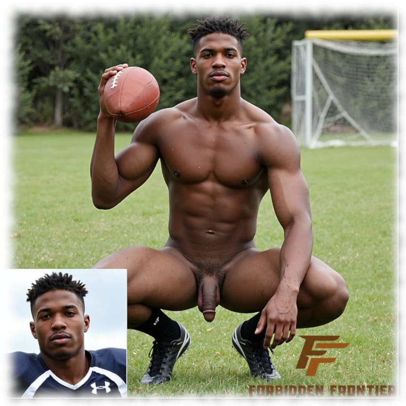 Dunkelhäutiger Footballer, hockend, Juwel der Liebe hängt frei zwischen den Beinen.
