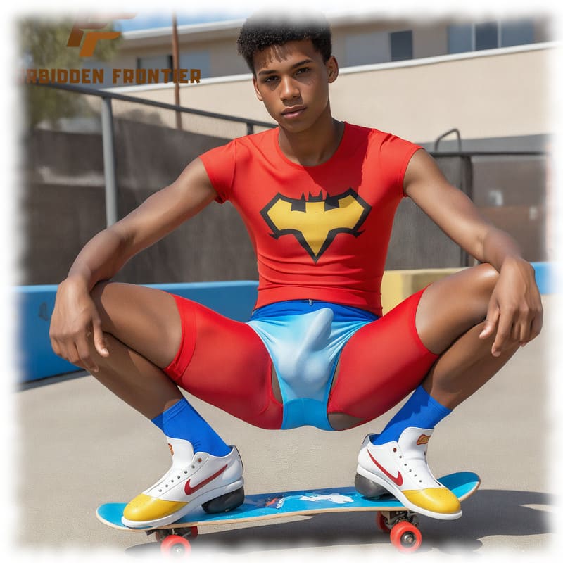 Dunkelhäutiger Twink auf Skate-Board hockend, Erregung und Fruchtknollen formen sich sichtbar