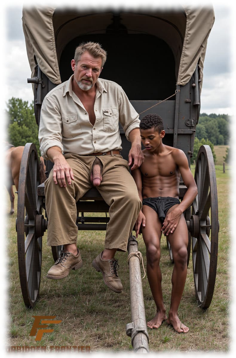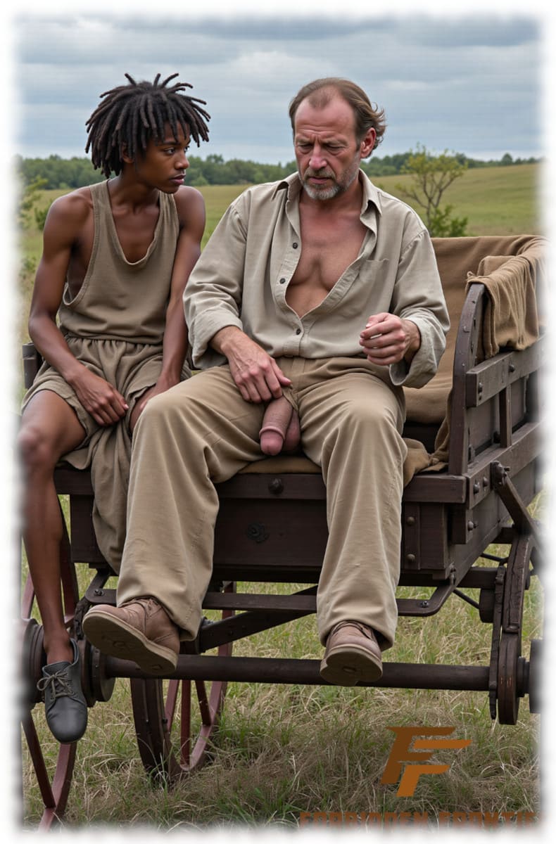Dunkelhäutiger und Weißer auf Pferdewagen, Weißer mit geöffneter Hose, Gauklerstab hängt heraus.