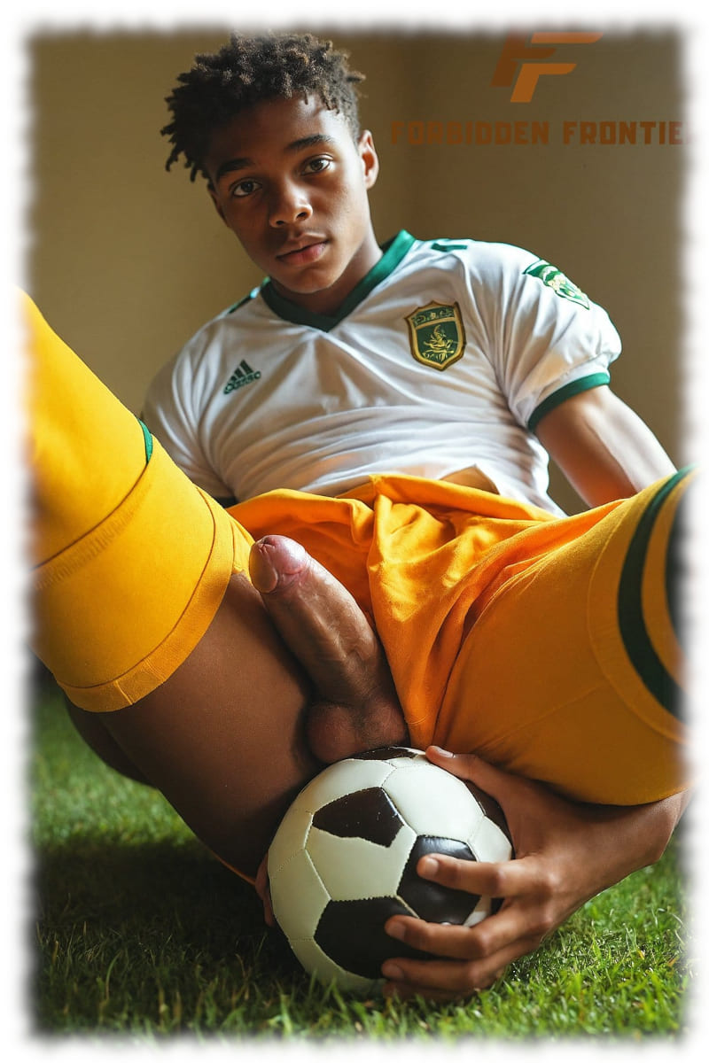Dunkelhäutiger Twink, auf Fußballfeld, zeigt sein Juwel der Liebe.