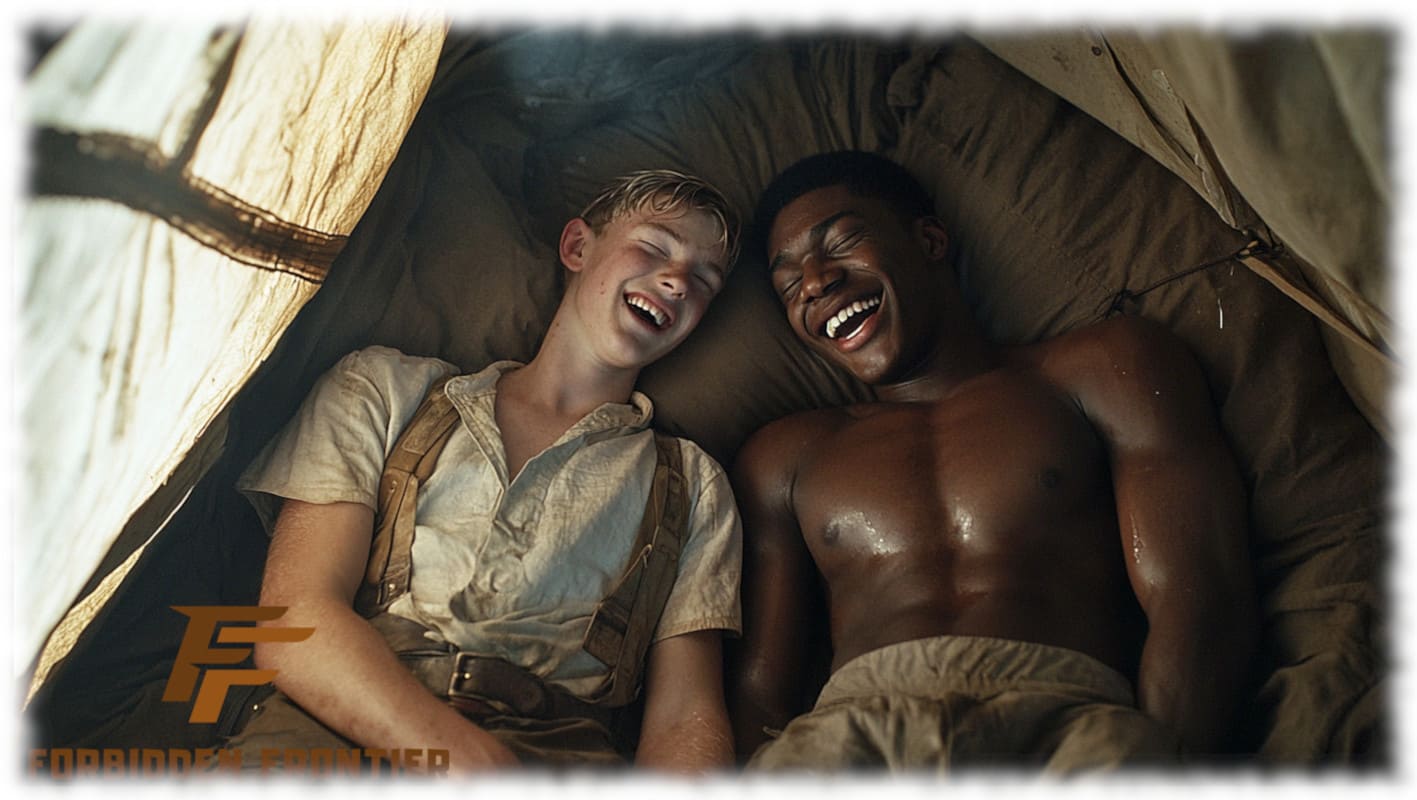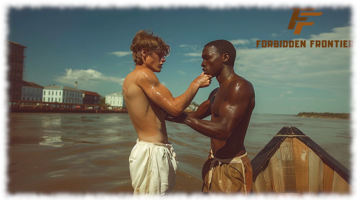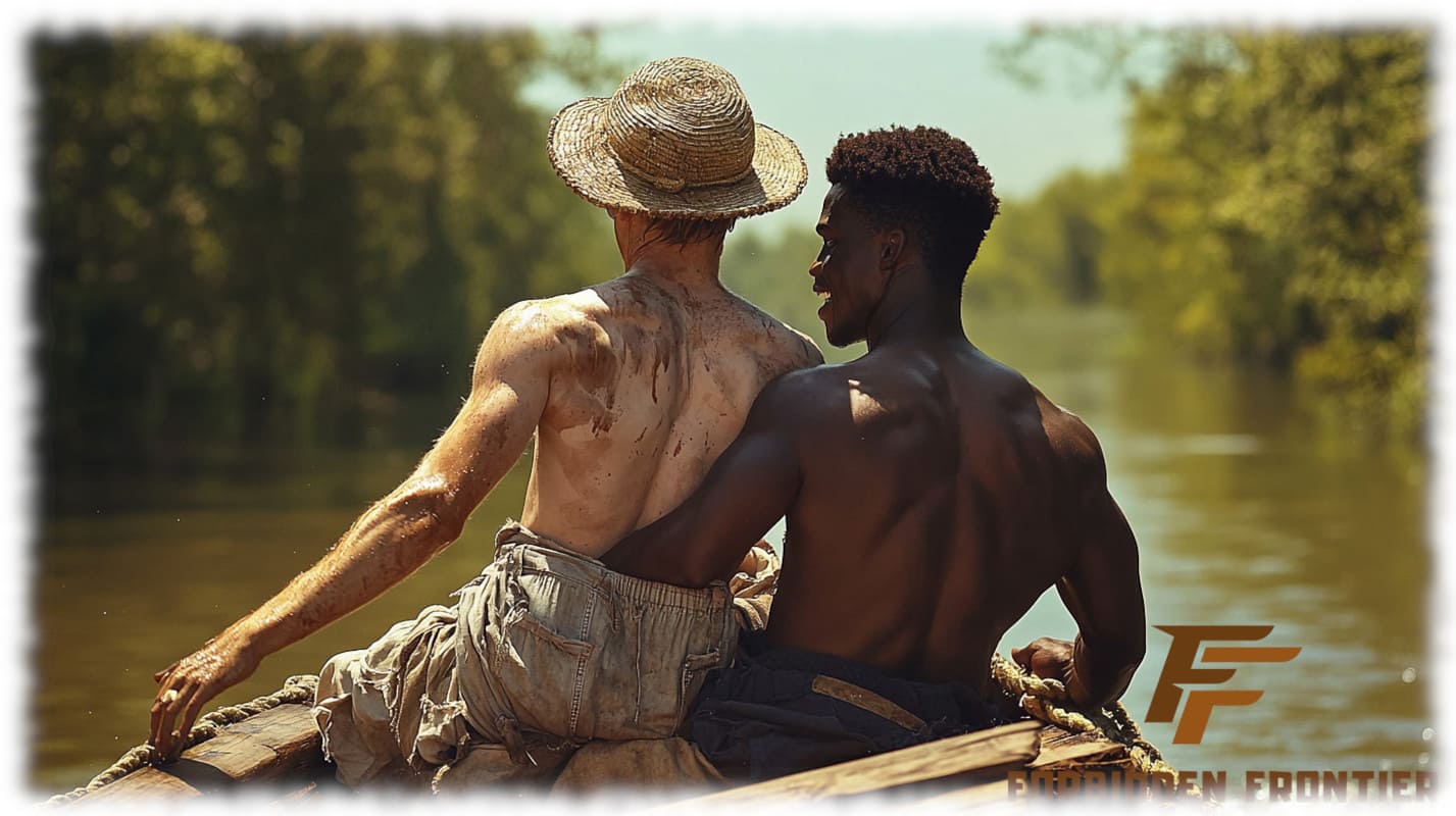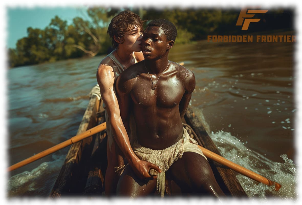 In Huck und Jim enthüllt Forbidden Frontier mit der Kraft moderner KI-Kunst jene tabuisierten Begierden und verbotenen Wünsche, die Mark Twain nicht erzählen konnte, als sein Roman 1884 erstmals erschien. Die Werke stellen Huck und Jim in einer neu interpretierten, homoerotischen Dimension dar – sinnlich, mutig und voller körperlicher Präsenz.
