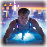 Futuristische Szene, Twink im Lederharness, auf allen Vieren, Licht scheint von Hinten gegen sein Juwel der Liebe.