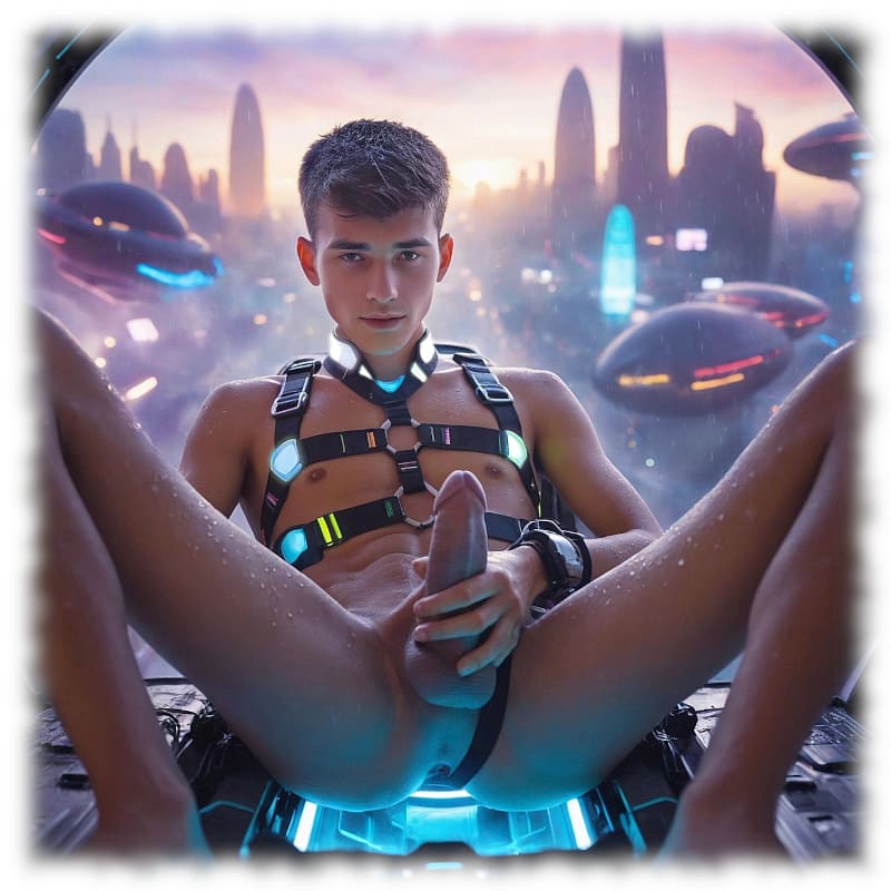 Futuristische Szene, Twink im Lederharness, breitbeinig, mit stolzem Schaft der Sehnsucht.