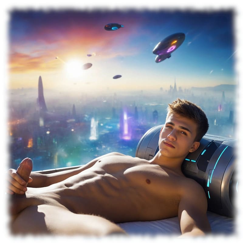 Futuristische Szene, Twink liegend, Hand hält die Lanze des Begehrens fest umschlossen.