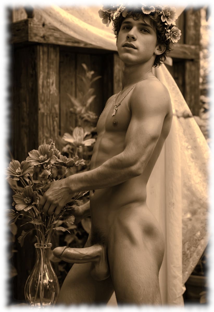 Von Gloeden farbig, Knabe mit Blumenkranz auf dem Kopf vor Blumenvase zeigt sein Juwel der Liebe im Seitenprofil.