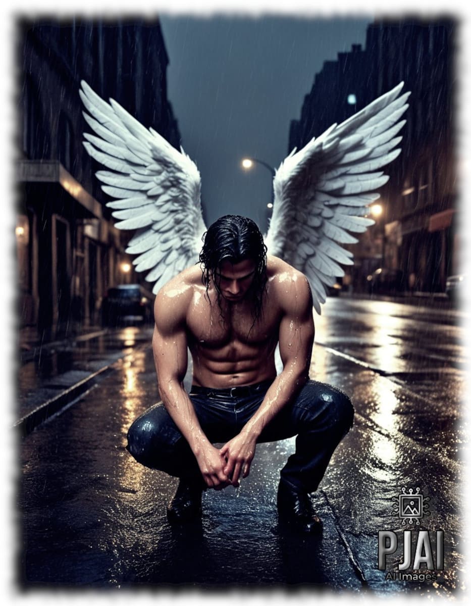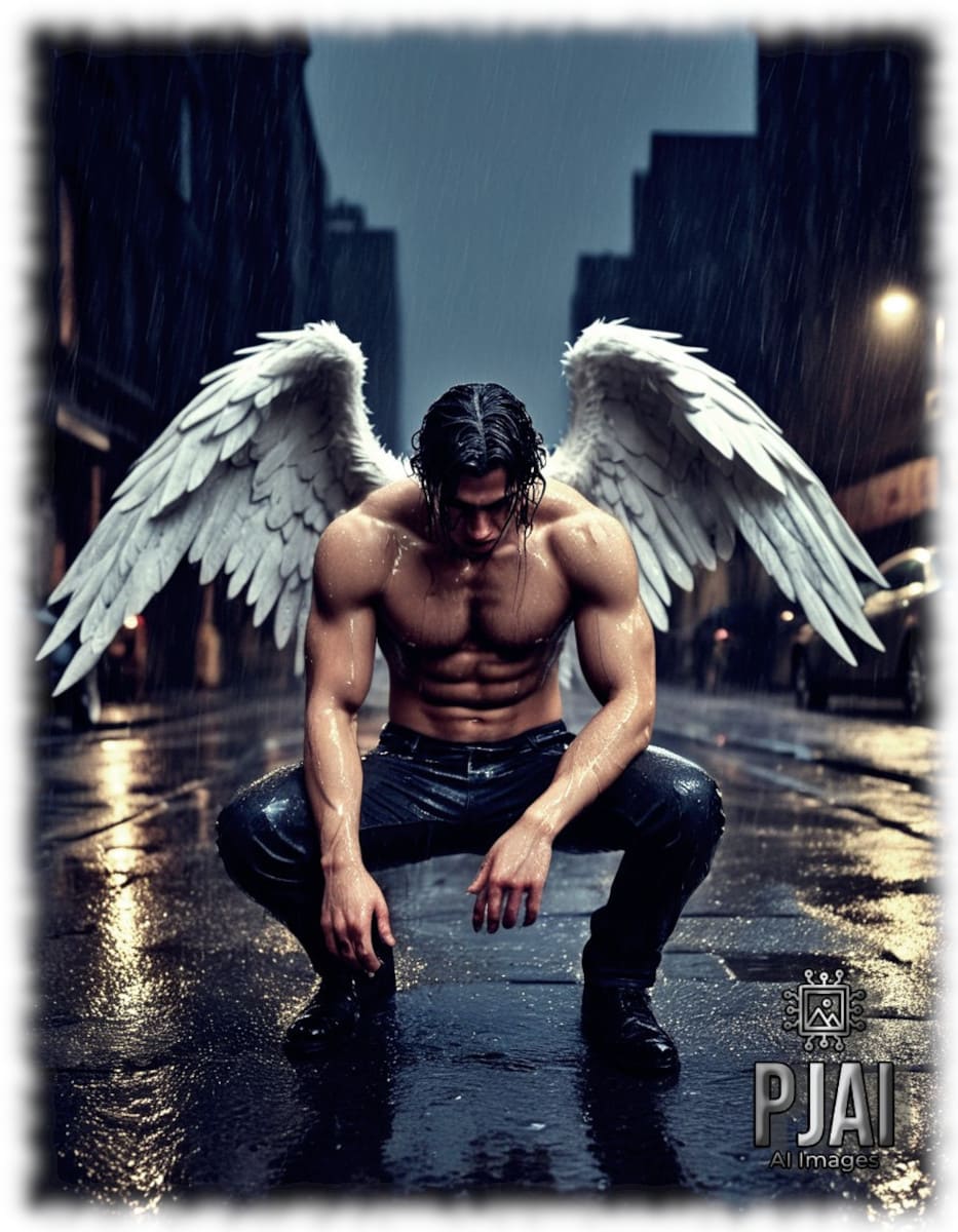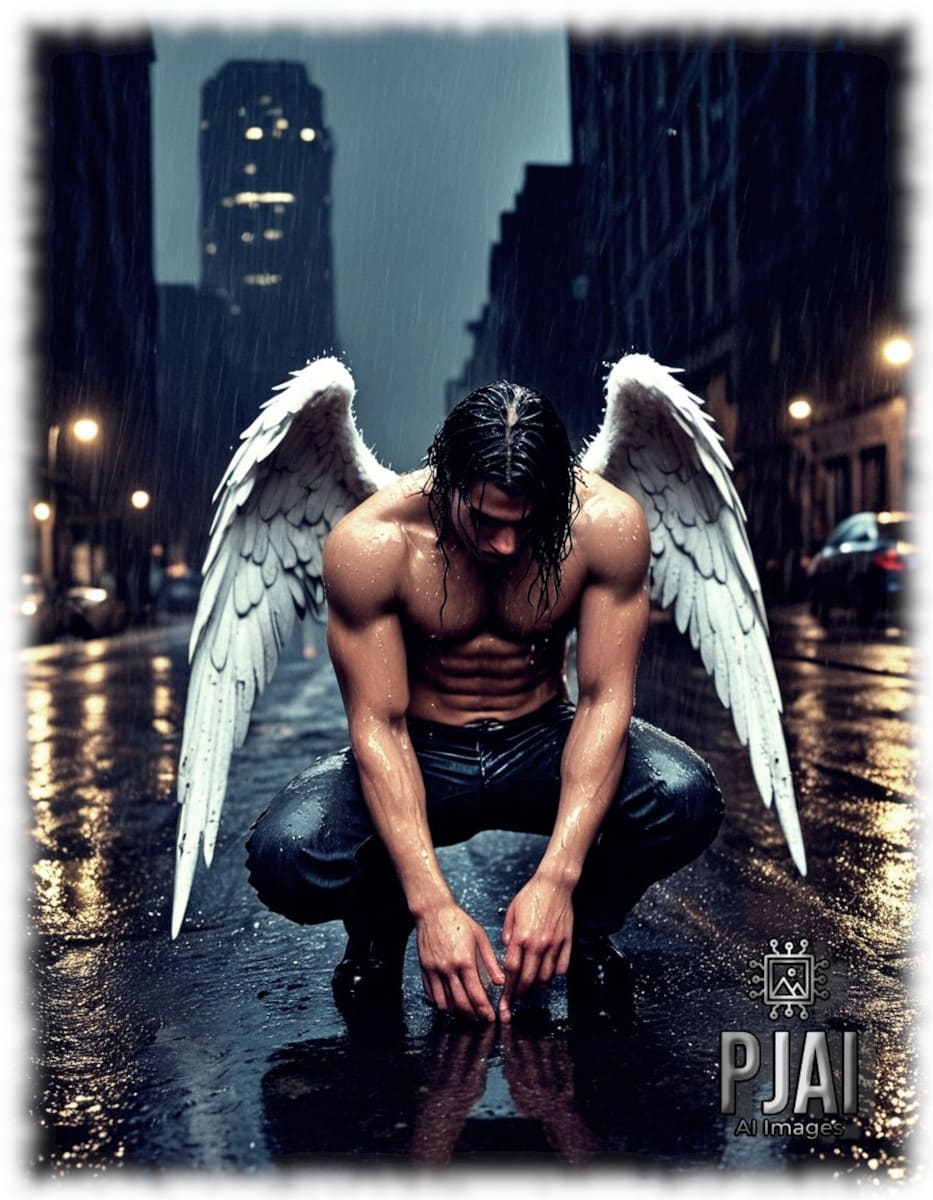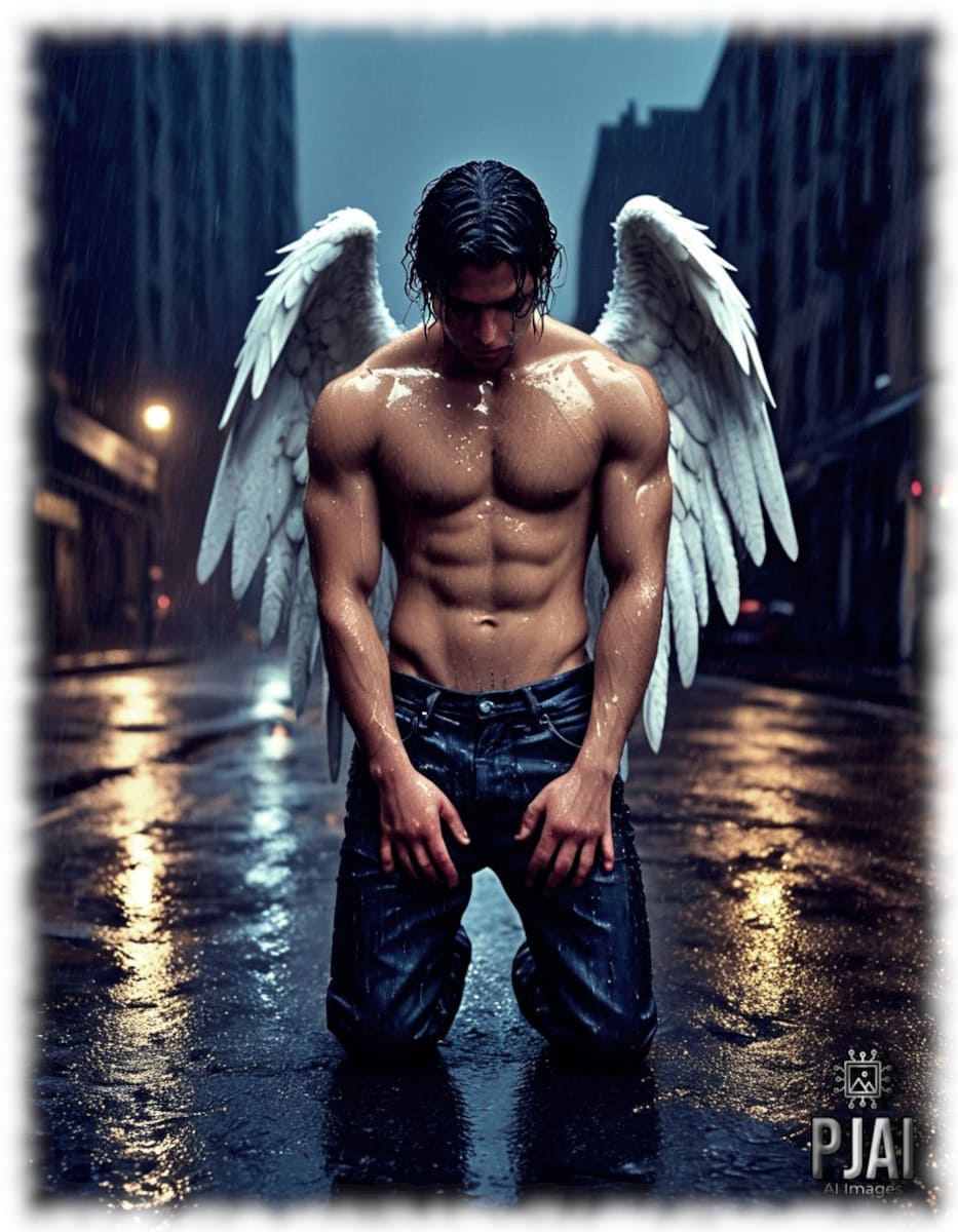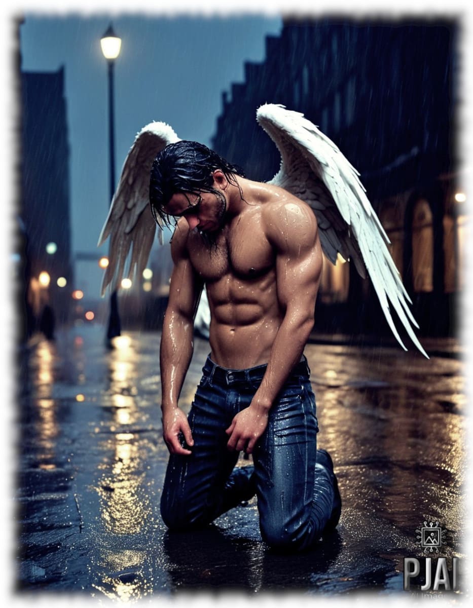 Engel mit weißen Flügeln in Großstadtkulisse seitlich knieend, mit nassem, nackten Oberkörper.