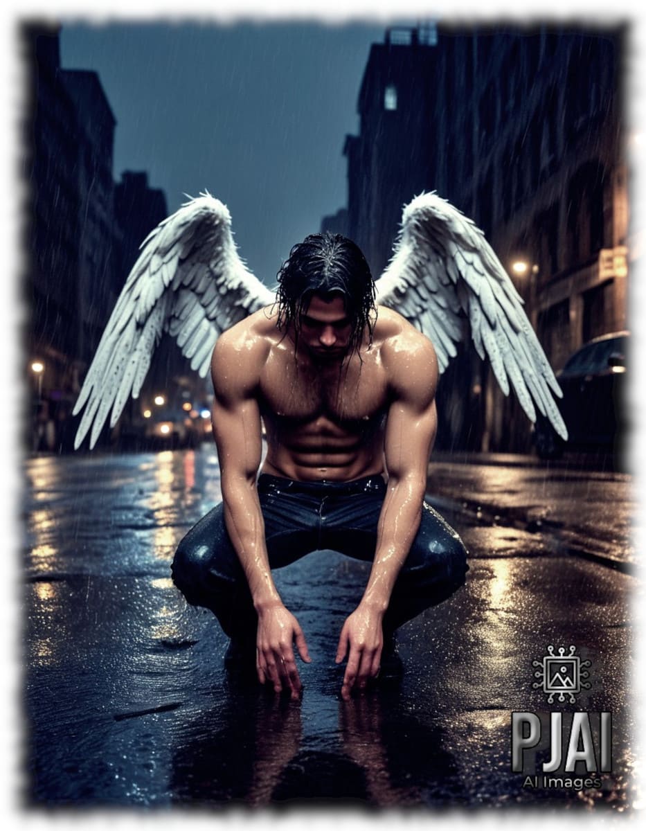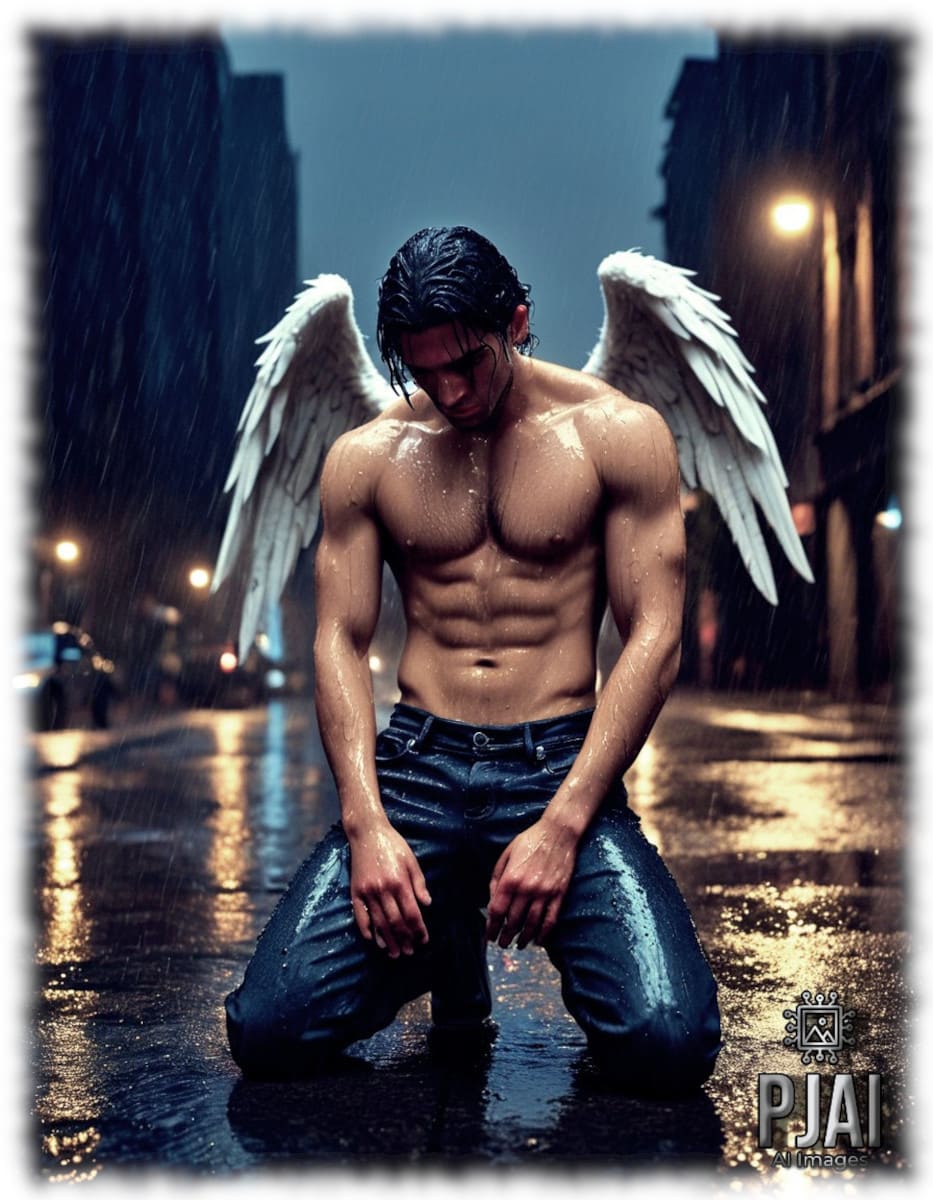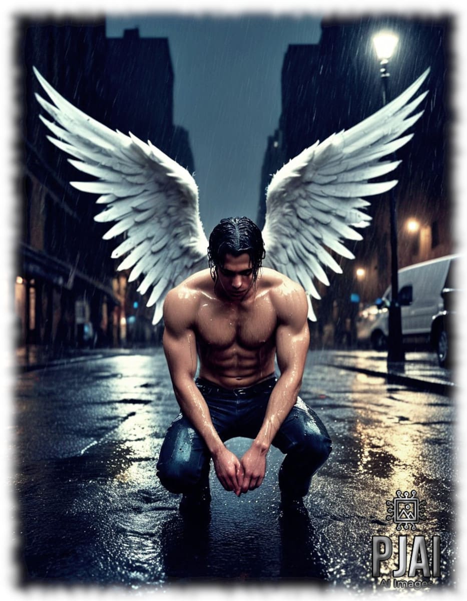 Engel mit weißen Flügeln in Großstadtkulisse knieend, mit mit nassem, nackten Oberkörper.