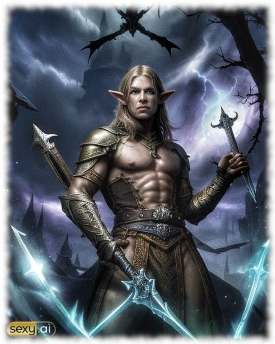 Ein muskulöser Elfenkrieger, dessen strahlender Körper und behaarter Morgenstrahl seine magische Ausstrahlung verstärken.