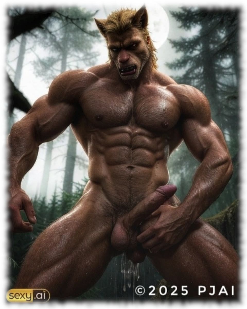 Werwolf steht breitbeinig, massive Erregungsrute im Zentrum.