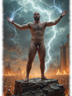 Die Bilder verbinden majestätische Posen mit sinnlicher Offenheit – häufig nackt und zeigefreudig, mit betonter Männlichkeit und unverhüllter Erregung. So entstehen kraftvolle, homoerotische Kunstwerke, die historische Größe mit leidenschaftlicher, körperlicher Präsenz verbinden.