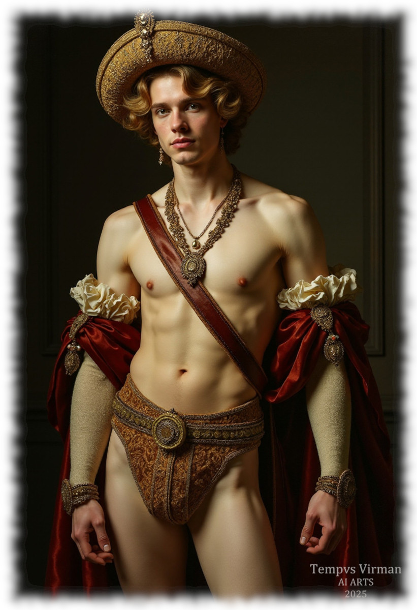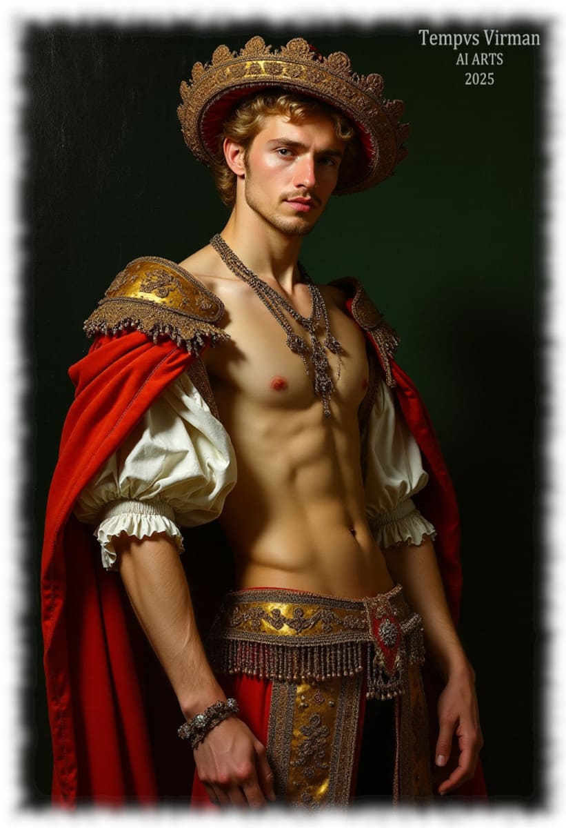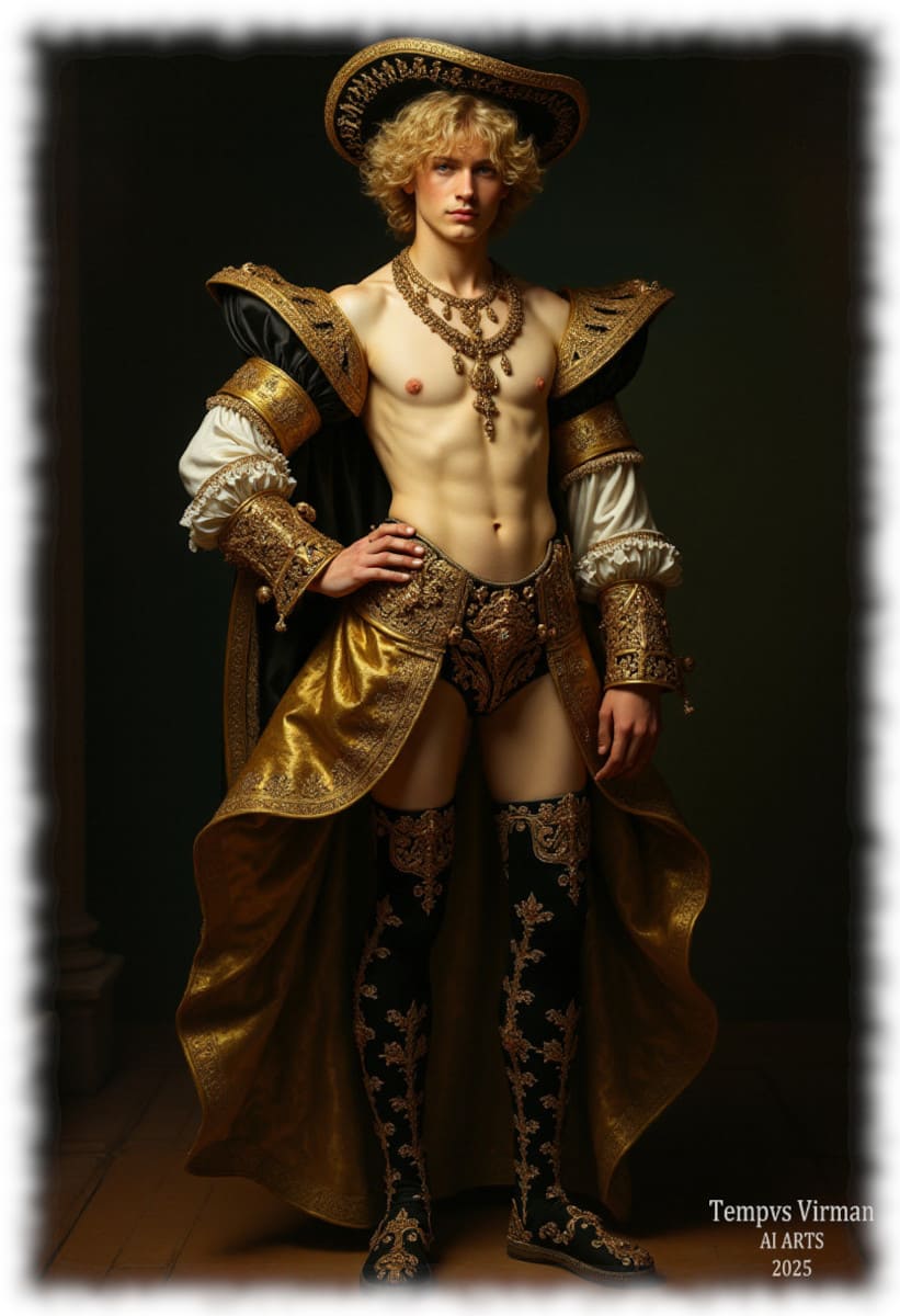 Historical Tempvs Virman ist eine Galerie, in der sich historische Eleganz, künstlerische Sinnlichkeit und modernste Technologie vereinen. Hier entdeckst du KI-generierte Bilder, die Mode vergangener Jahrhunderte – von antiker Gewandung bis zu viktorianischer Schneiderkunst – mit homoerotischer Kunst in einer zeitgemäßen Bildsprache neu interpretieren.