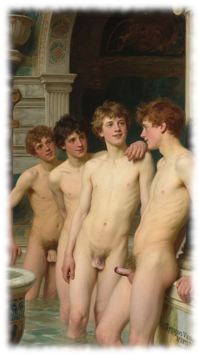 Vier Jünglinge in antikem Bad stehend, ihre Funken des Eros teilweise sichtbar.