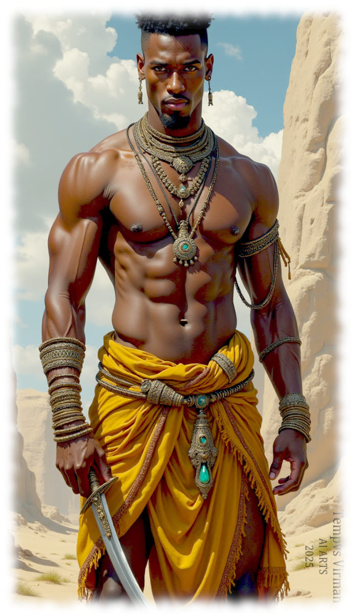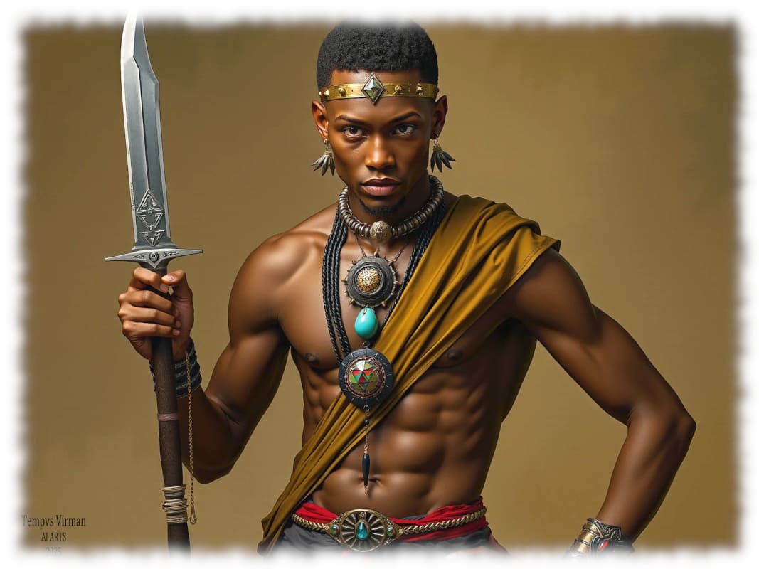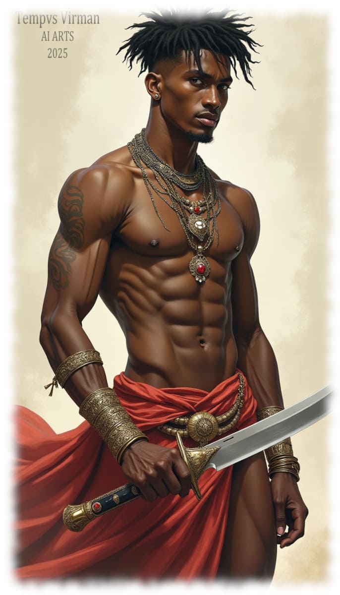 Dunkelhäutiger Krieger, freier muskulöser Oberkörper mit Schwert in der Hand.