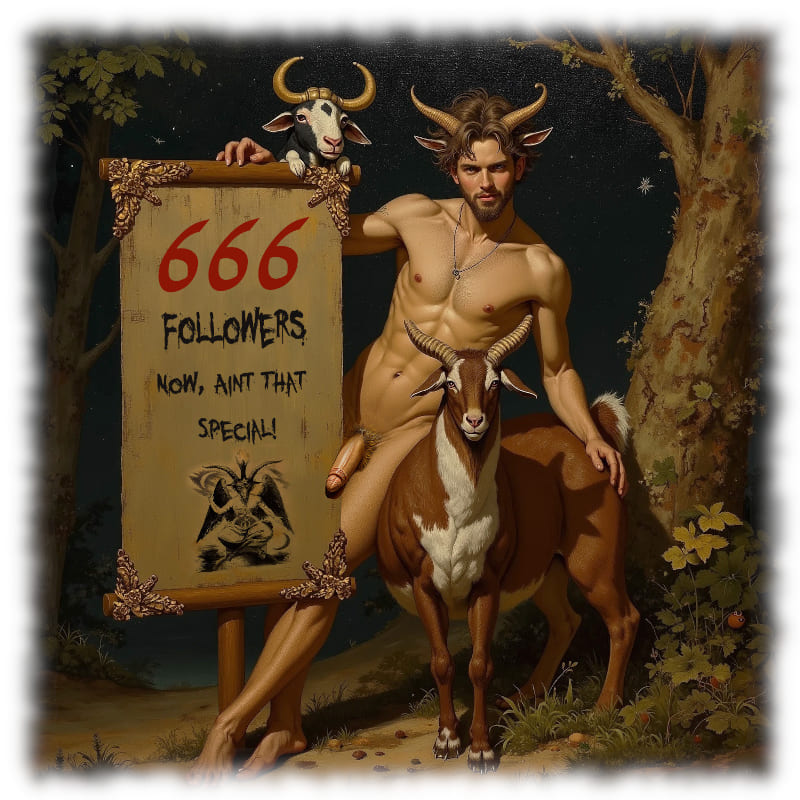 Gehörnter Dämon an Ziegenbock gelehnt, sein Juwel der Sünde zeigt sich.