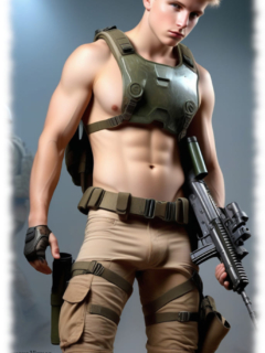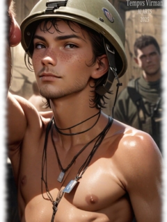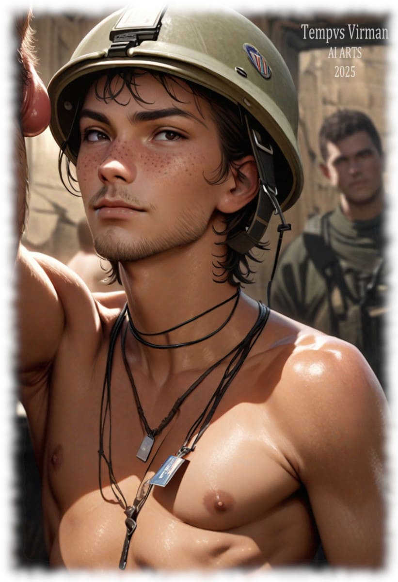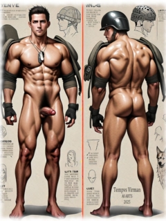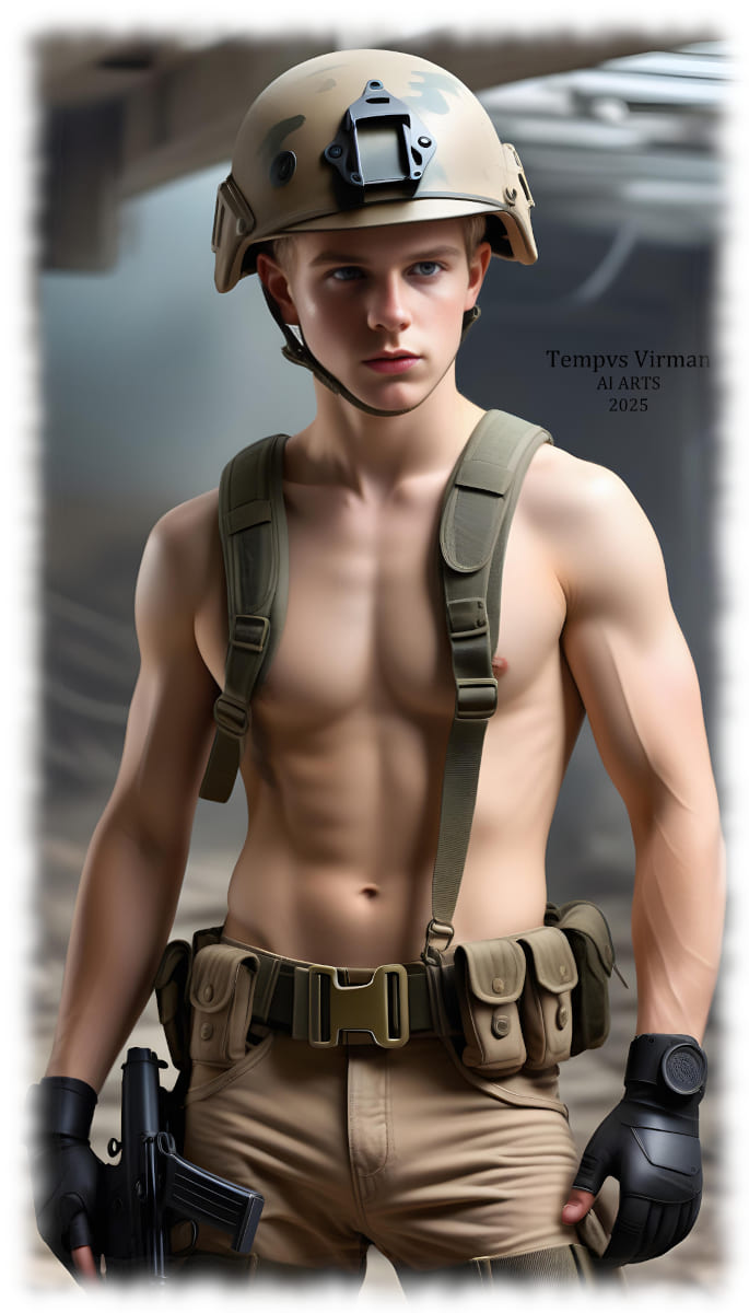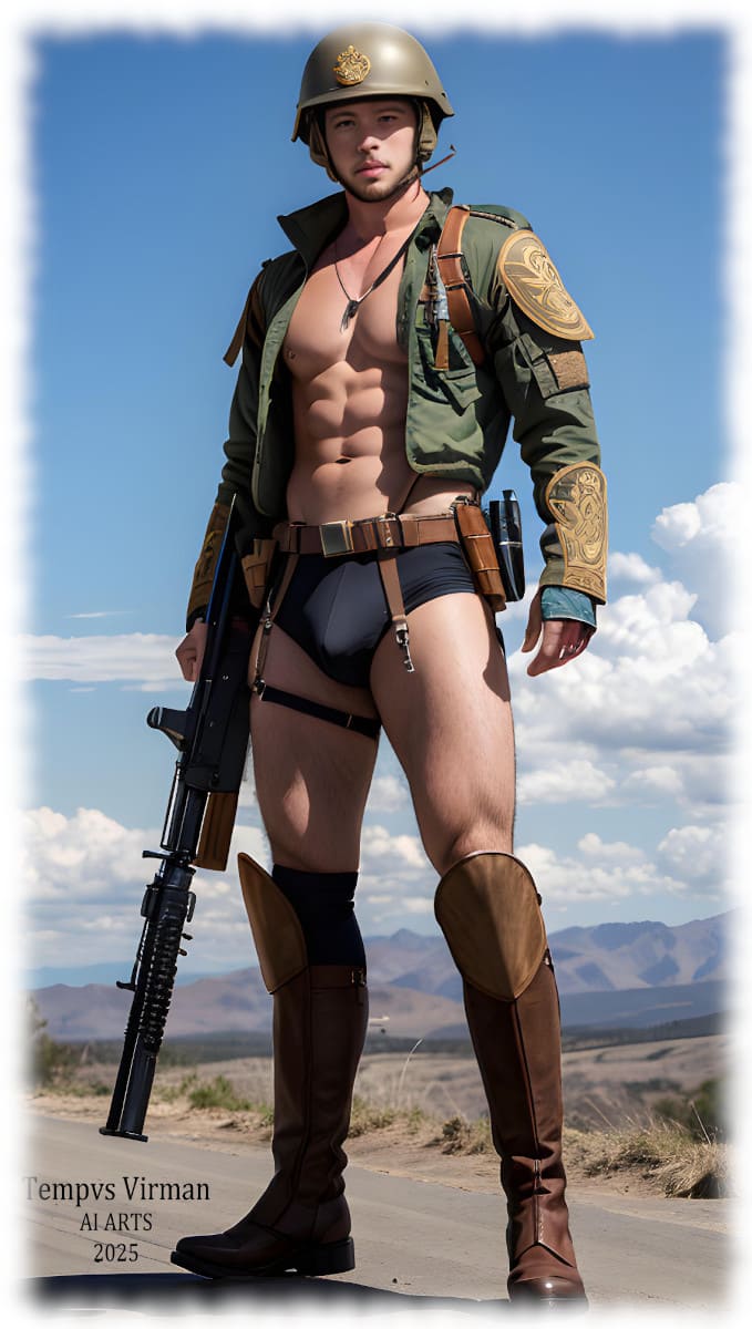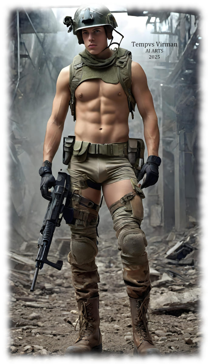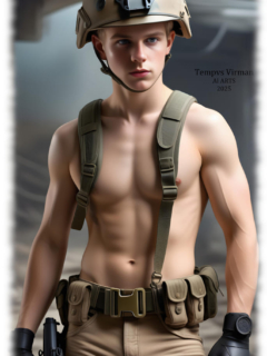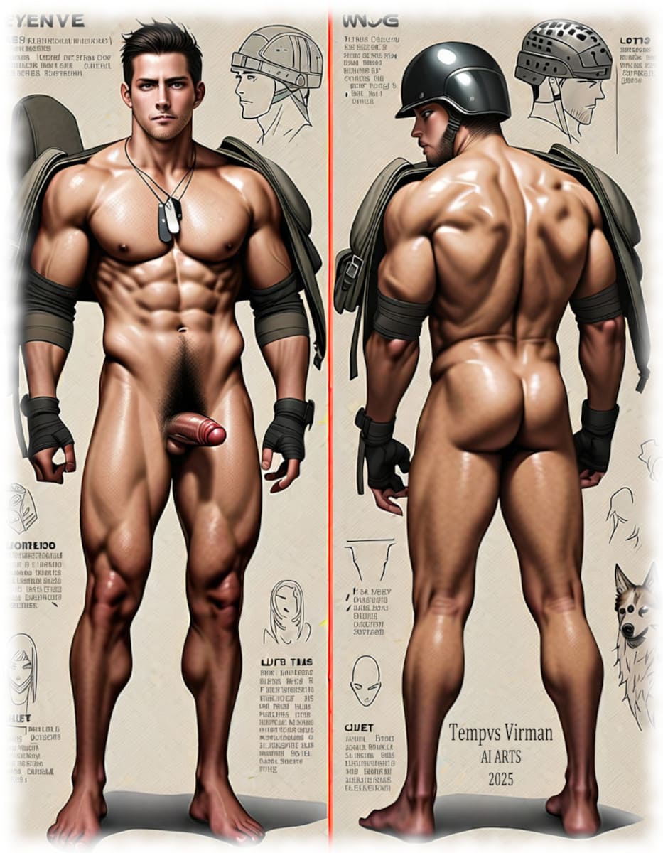 Military Bodys von Tempvs Virman ist eine Galerie, die die rohe Kraft, Männlichkeit und sinnliche Ausstrahlung des männlichen Körpers in militärischer Ästhetik feiert. Mit KI-generierten Bildern entstehen intensive Porträts und Szenen von Soldaten – in Uniform, in Bewegung oder nackt – die Disziplin, Stärke und homoerotische Spannung zu einem fesselnden visuellen Erlebnis vereinen.